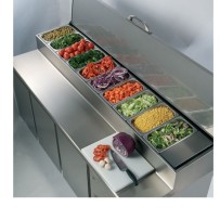 Excelente gama de mesas de refrigeradas para la elaboración de ensaladas y pizzas. Bajomostradores con toma de Ingredientes, Mesas para pizzas, Mesas para preparación de ensaladas, mesas de trabajo con refrigeración y un sinfín de nombres para identificar este equipo indispensable en la hostelería. Es la forma de ganar tiempo, optimizar los espacios y rapidez en el servicio y preparación de platos. Diríamos que la mesa fría con toma de ingredientes se ha convertido en un autentico bombazo en las cocinas y zonas de preparación de alimentos. Cuando nuestro objetivo es la preparación de Sándwiches o bocadillos la mesa fría es nuestro compañero ideal que ocupa el espacio necesario para una preparación óptima y de igual forma si hablamos de la preparación de ensaladas o pizzas.