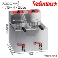 Freidora profesional DOBLE construida totalmente en acero inoxidable. Funciona con un termostato de trabajo regulable hasta 200º C a una velocidad increible gracias a su resistencia blindada en acero de 6000W de potencia en cada cabezal. En cada cuba dispone de capacidad de 4,5 litros en agua y 15 litros en aceite. Grifo incorporado para vaciar el aceite.