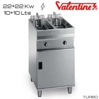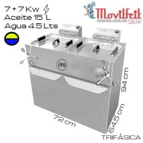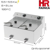 Freidora industrial DOBLE FRY-13+13 de capacidad total de 17 litros (Dos cubas de 8.50 litros) y 10000 W de potencia total (5000W en cada resistencia). Cuenta con dos cubas fijas con bordes redondeados e inclinados hacia los grifos para cada cuba de vaciado y sus cabezales son girables y extraibles para facilitarnos su limpieza. Como podemos observar a simple vista, es una freidora robusta gracias al estar construida en acero inoxidable. Para su funcionamiento accionaremos el termostato de trabajo a la temperatura deseada hasta 190º C y esta dotada de microrruptor y termostato de seguridad que se accionará al alcanzar los 210º C.